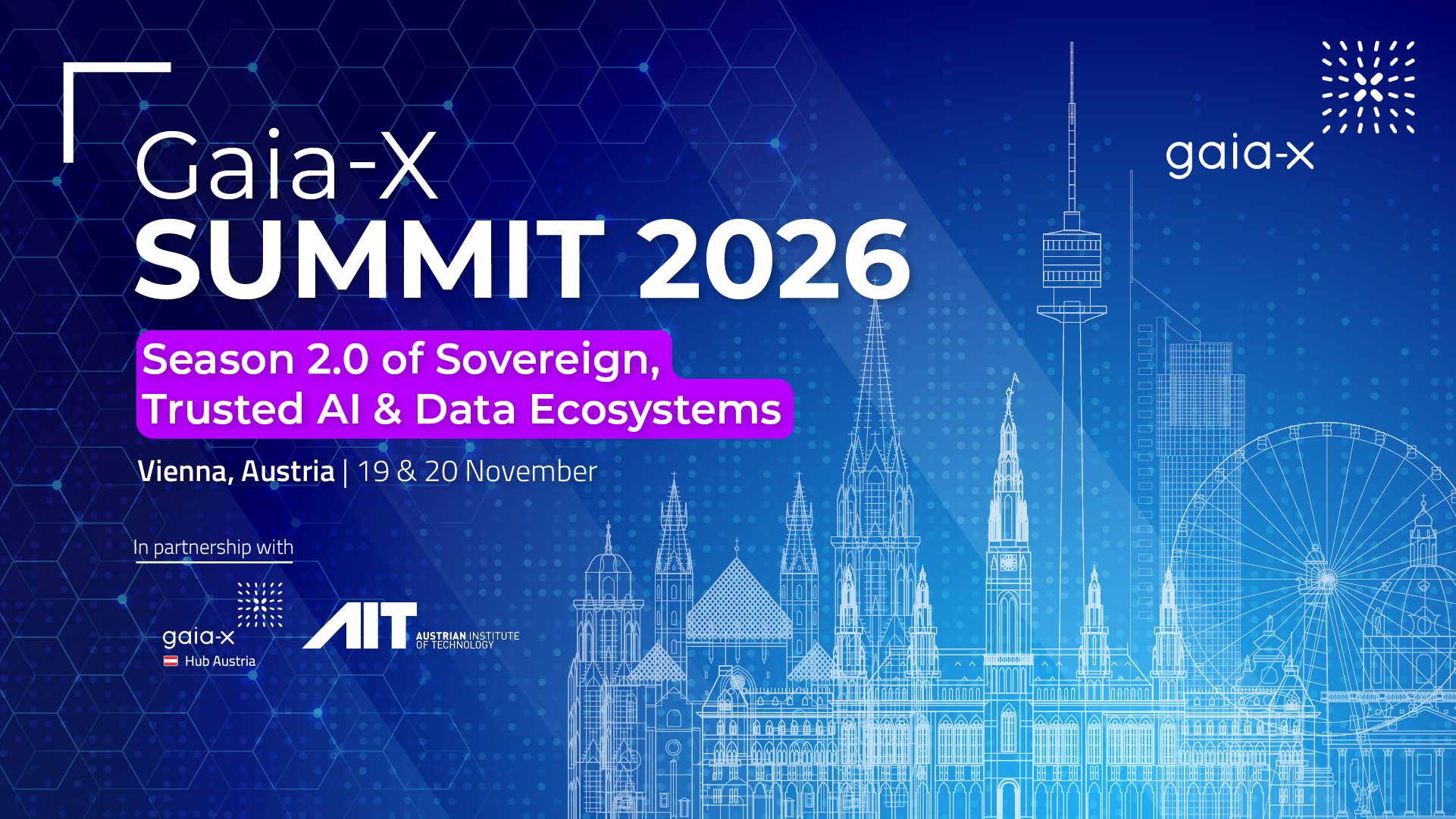 The Gaia‑X Summit 2026 will take place on 19–20 November in Vienna, Austria, in cooperation with Gaia‑X Hub Austria, operated by AIT Austrian Institute of Technology GmbH. Under the theme “Season 2.0 of Sovereign, Trusted AI & Data Ecosystems”, the summit will explore trusted data access, AI value creation, and collaborative digital ecosystems in Europe.