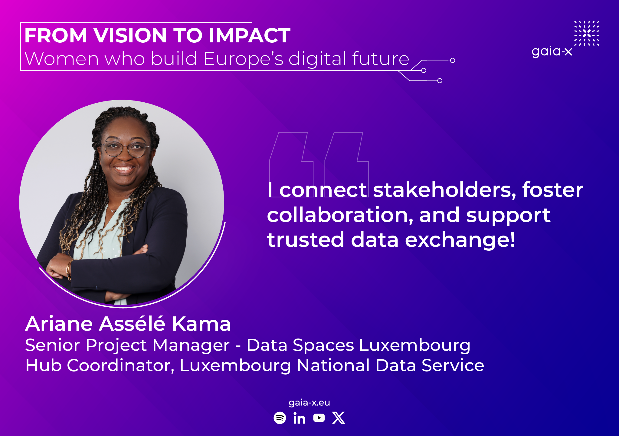 Dr. Ariane Assélé Kama holds a PhD in Medical Informatics and brings over 14 years of experience in Data and Digital Strategy, Leadership, Innovation, and Interoperability. With strong expertise in project management and large-scale IT transformation, she coordinates the Data Spaces Hub Luxembourg, facilitating collaboration and concrete initiatives around trusted and interoperable data sharing.